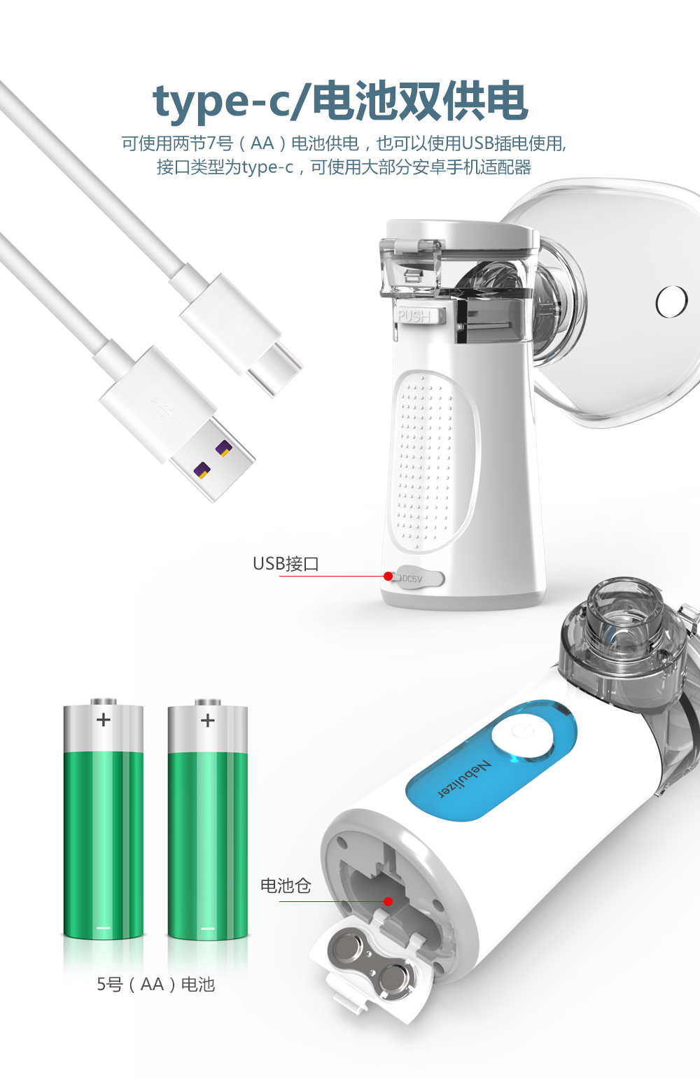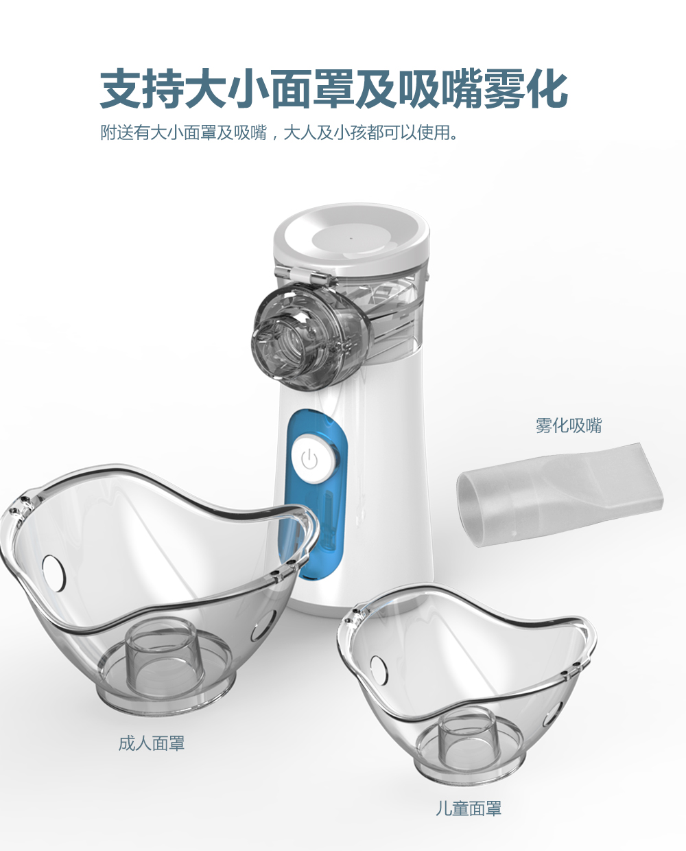 5)根据情况不同可以选择两种雾化方式,即面罩雾化(分成人及儿童面罩)及咬嘴雾化;