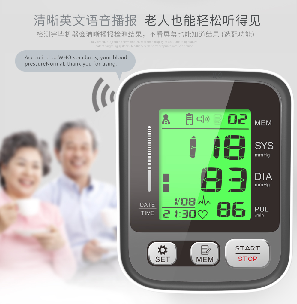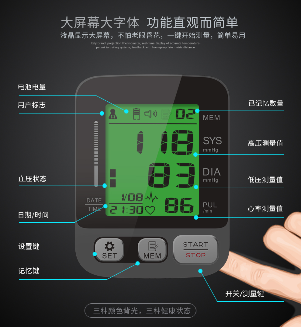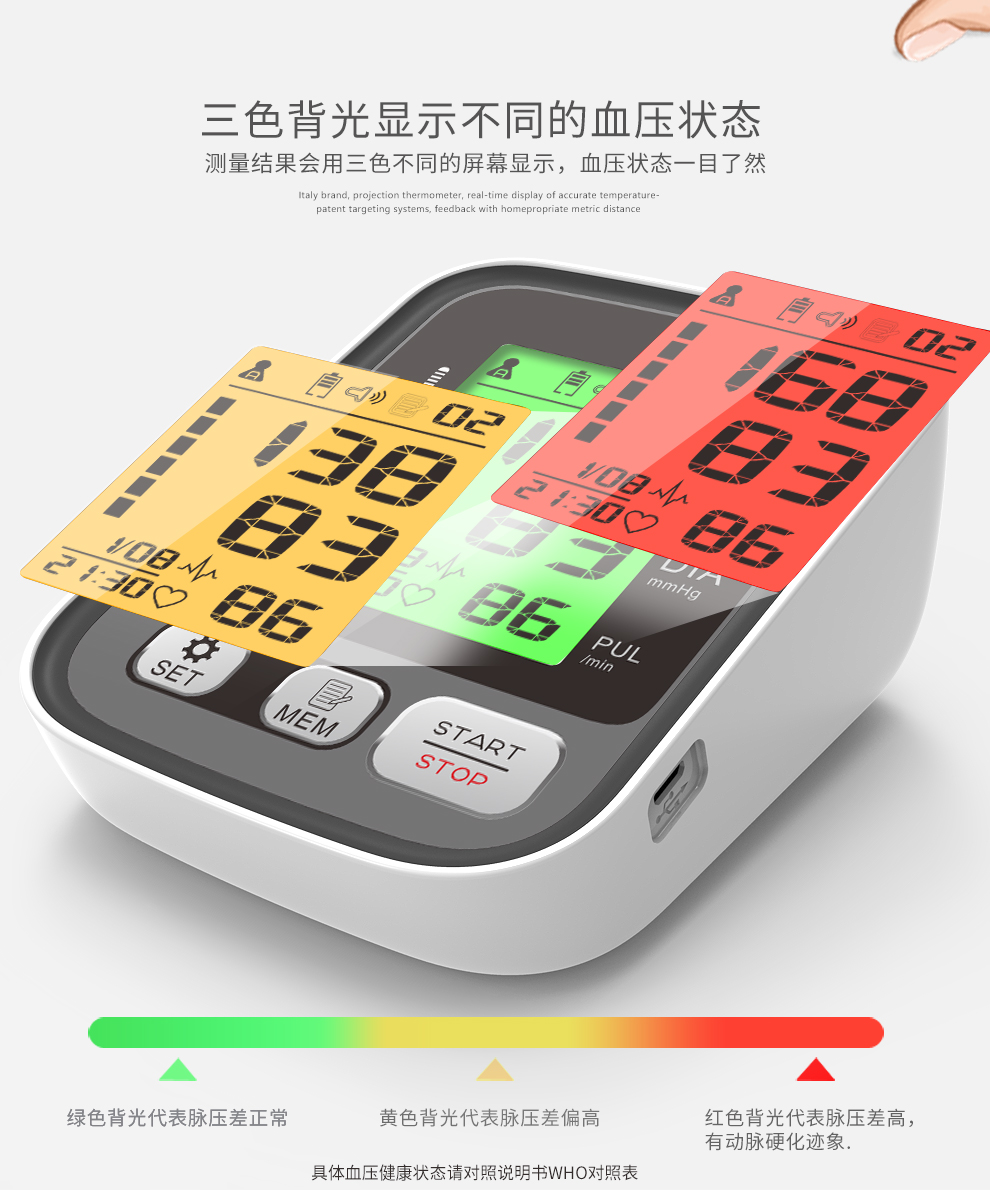 三色背光显示血压状态,血压健康状态一目了然!