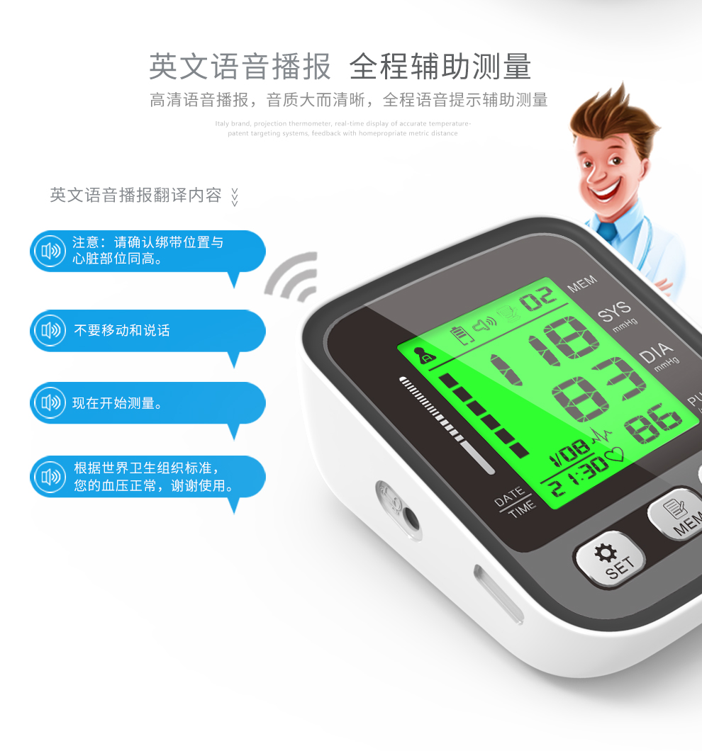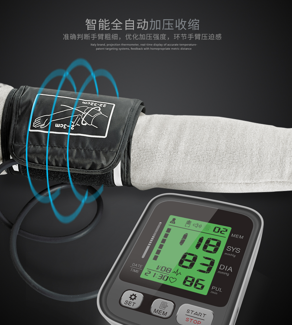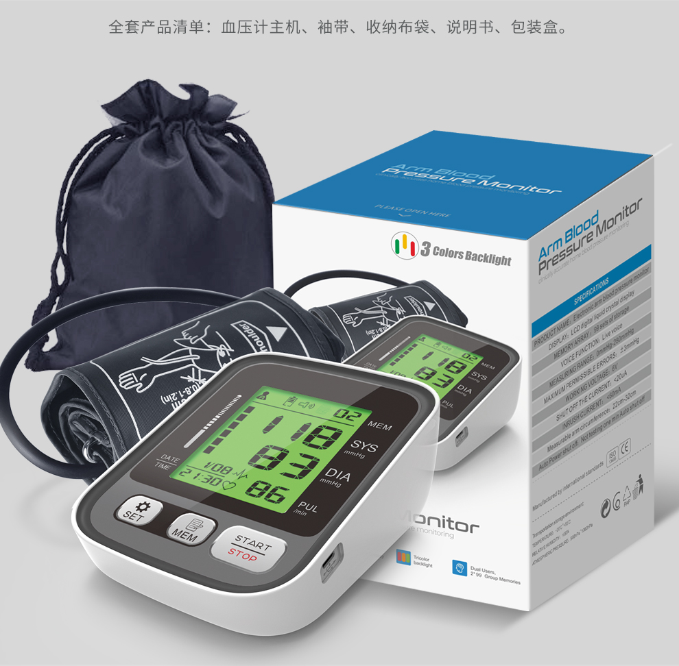 三色背光显示血压状态,血压健康状态一目了然!全自动智能加压手臂式电子血压计,简约而时尚的外观,高清大屏大字,一键测量,心率监测,智能语音,双人记忆,测量方便。
