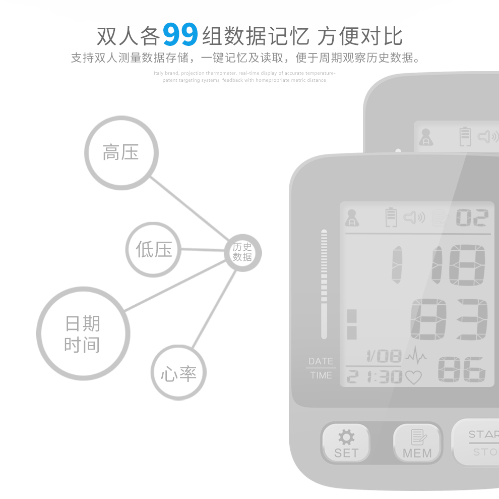 7.存储数据:双人99组测量结果记忆,可以显示最近3次测量结果的平均读数,方便用户调取数据对比