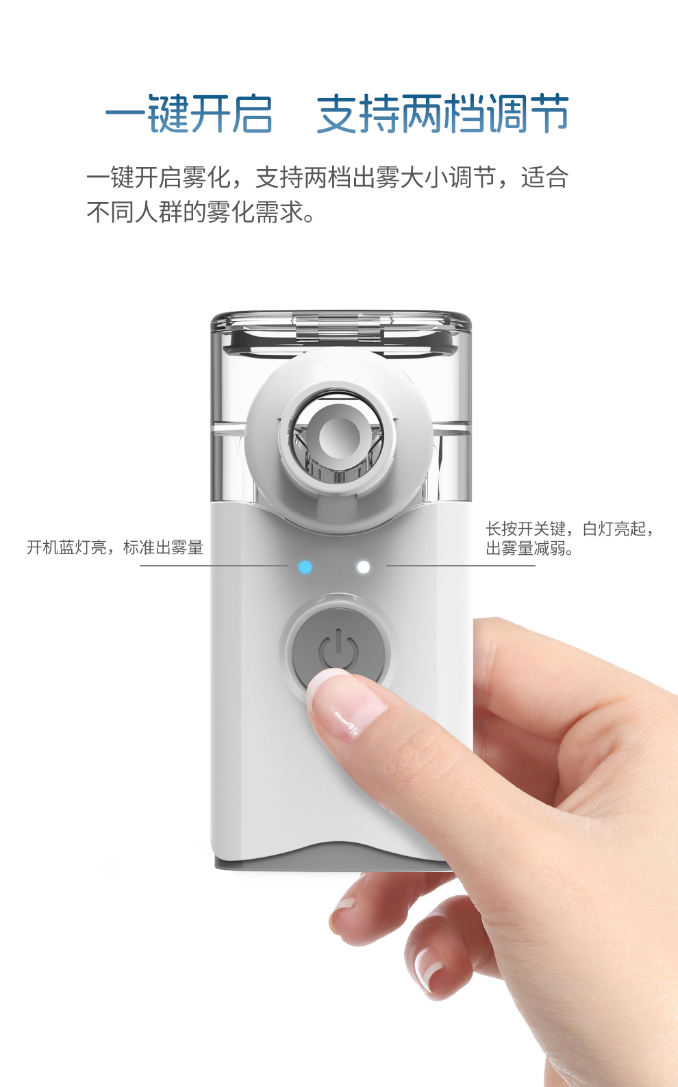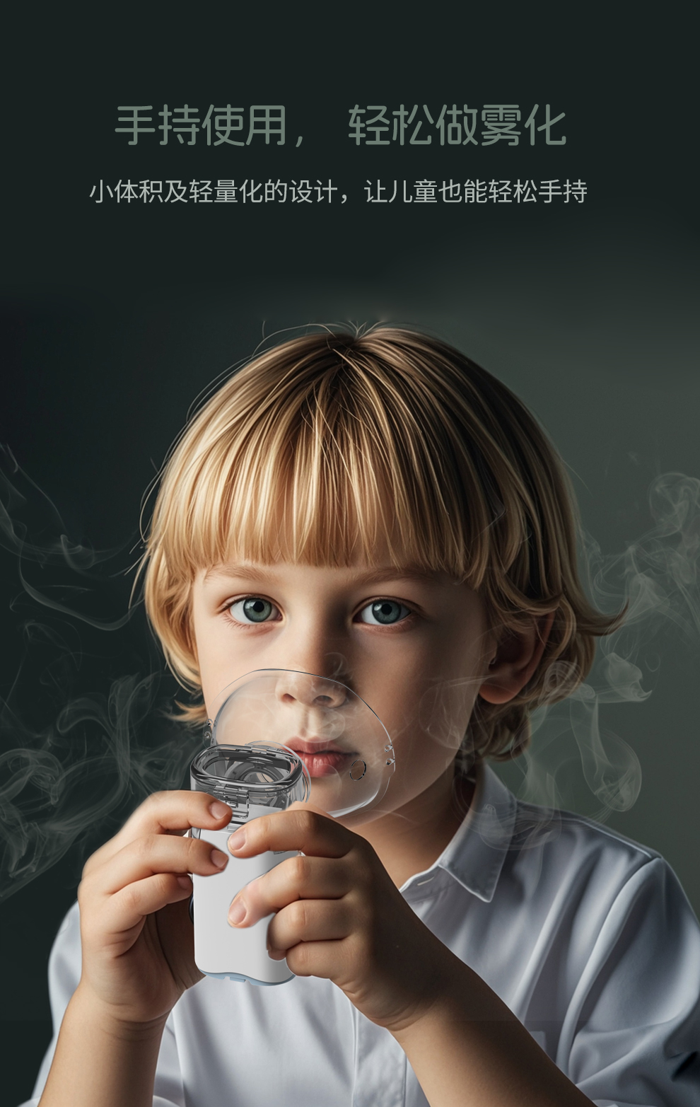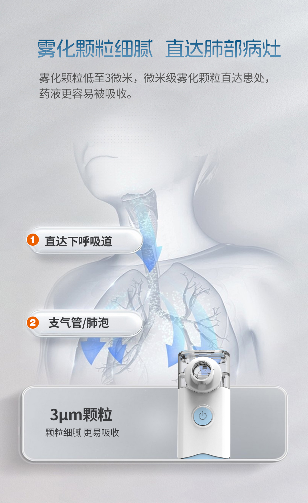主要用于治疗各种上下呼吸系统疾病,如感冒、发热、咳嗽、哮喘、咽喉肿痛、咽炎、鼻炎、支气管炎、尘肺等气管、支气管、肺泡、胸腔内所发生的疾病。雾化吸入治疗是呼吸系统疾病治疗方法中一种重要和有效的治疗方法,采用雾化吸入器将药液雾化成微小颗粒,药物通过呼吸吸入的方式进入呼吸道和肺部沉积,从而达到无痛、迅速有效治疗的目的。雾化器适用于儿童、小孩、老人、特殊病患者、成人学生等。
