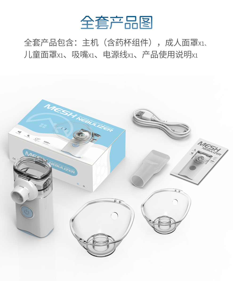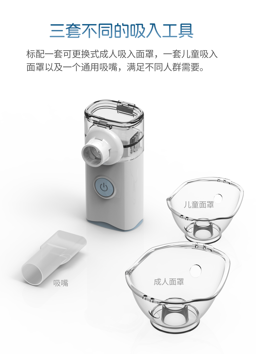 5)根据情况不同可以选择两种雾化方式,即面罩雾化(分成人及儿童面罩)及咬嘴雾化;